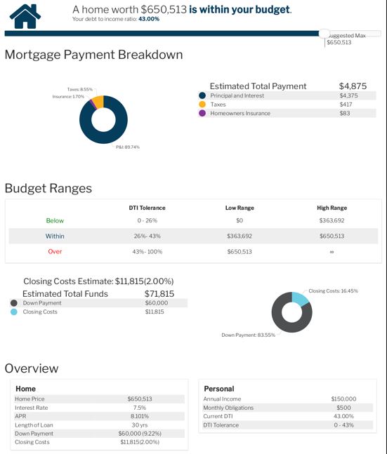 Using our simple affordability calculator, the image below shows a snapshot of what a buyer could expect to afford after inputting their income, estimated mortgage rate, amortization term, and down payment amount.