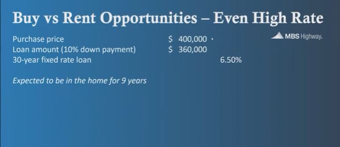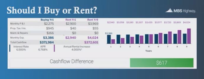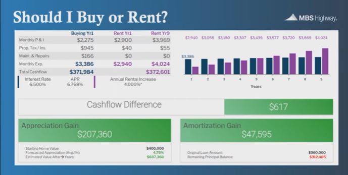 Utilizing the Buy vs Rent comparison tool, let’s examine a scenario where a customer contemplates purchasing a $400,000 home with a 10% down payment, resulting in a $360,000 loan at a fixed rate of six and a half percent over nine years.