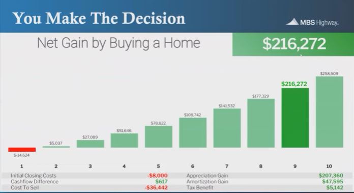 Considering amortization, wherein mortgage payments contribute to equity and historical appreciation rates, homeownership emerges as a lucrative investment. Over nine years, staying in the purchased home could yield a net benefit of approximately $216,000.